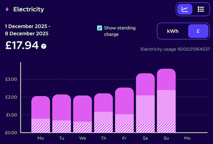 Our daytime rate is 25.57p/kWh (1.4p per unit dearer than 24.15p/kWh on flexible), but nearly all our consumption is now covered by the battery with a tiny bit of help from the Solar panels. The off peak charge costs 8.5 p per unit, so if we add on inverter losses, you could say it costs us 10p per unit.